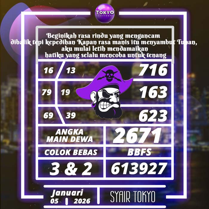 PREDIKSI TOGEL TOKYO HARI INI SENIN 5 JANUARI 2026 adalah merupakan rumusan dan perhitungan ahli togel yang mempelajari semua data-data live draw TOKYO yang telah keluaran TOKYO, jitu togel prediksi mempelajari dan menyusun cara terbaik sehingga menghasilkan rumus togel jitu untuk membantu pecinta togel erek 88 agar segera mendapatkan jackpot. Untuk pecinta togel ketahu i stragegi jitu ini di rumuskan bocoran jitu karena telah kami buktikan sendiri sebelumnya sehingga prediksi yang kami berikan adalah prediksi prediksi totokita terbaik memperbesar peluang kemenangan dalam bermain toto TOKYO. PREDIKSI TOGEL TOKYO HARI INI mempelajari dan mengunakan prediksi prediksi angka togel memang memperbesar peluang jackpot syair angka, tetapi pecinta togel angka main hari ini tetap harus prediksi TOKYO 4d mengutamakan rumus togel hari ini dan firasat pecinta togel prediksi terjitu.